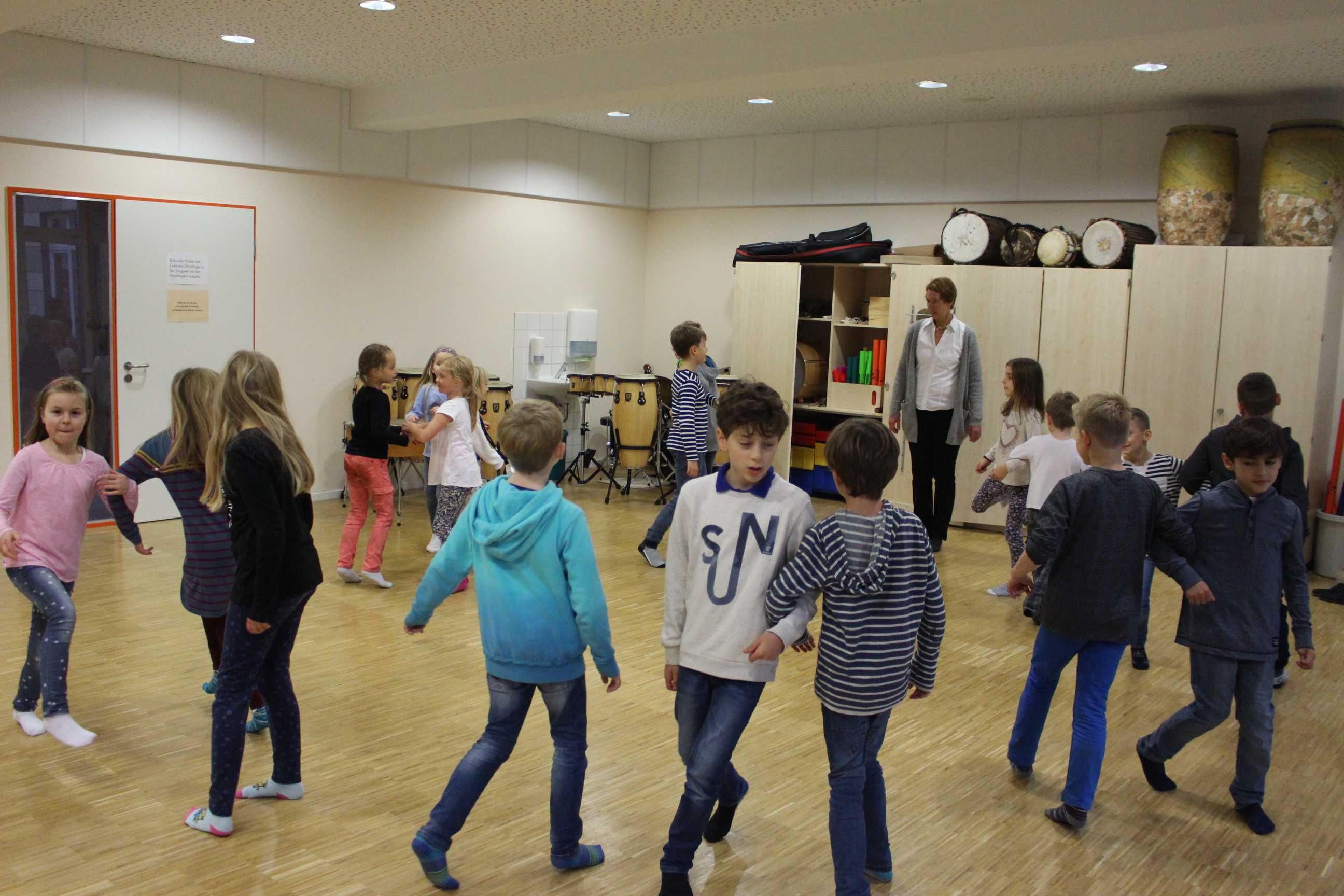 Auf dem Bild tanzen die Schüler_innen einen typischen italienischen Tanz.