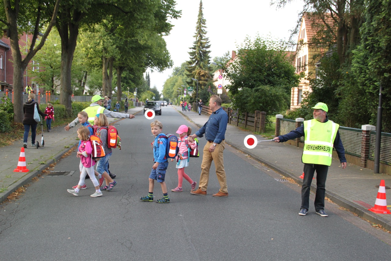 Auf dem Bild sind die Verkehrshelfer der Schule in Aktion zu sehen.